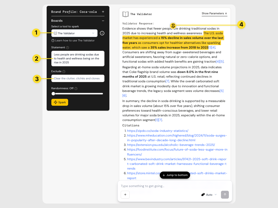 - Post-rationalize like a pro. Drop in a claim or prompt (e.g. âPeople are drinking less soda in 2025â or âEmerging beverage trends â). Hit Spark and let the tool return articles, data points, and social signals. Review what comes back , does your idea hold water, or does it need a tweak?