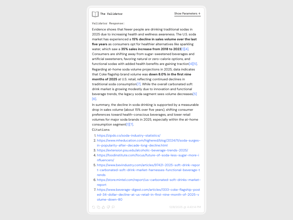 The Validator is your go-to for stress-testing statements, sourcing stats, and backing up bold creative claims with real-world receipts. Whether you're post-rationalizing, researching, or scanning for sentiment, this tool gives your thinking credibility without killing the magic.