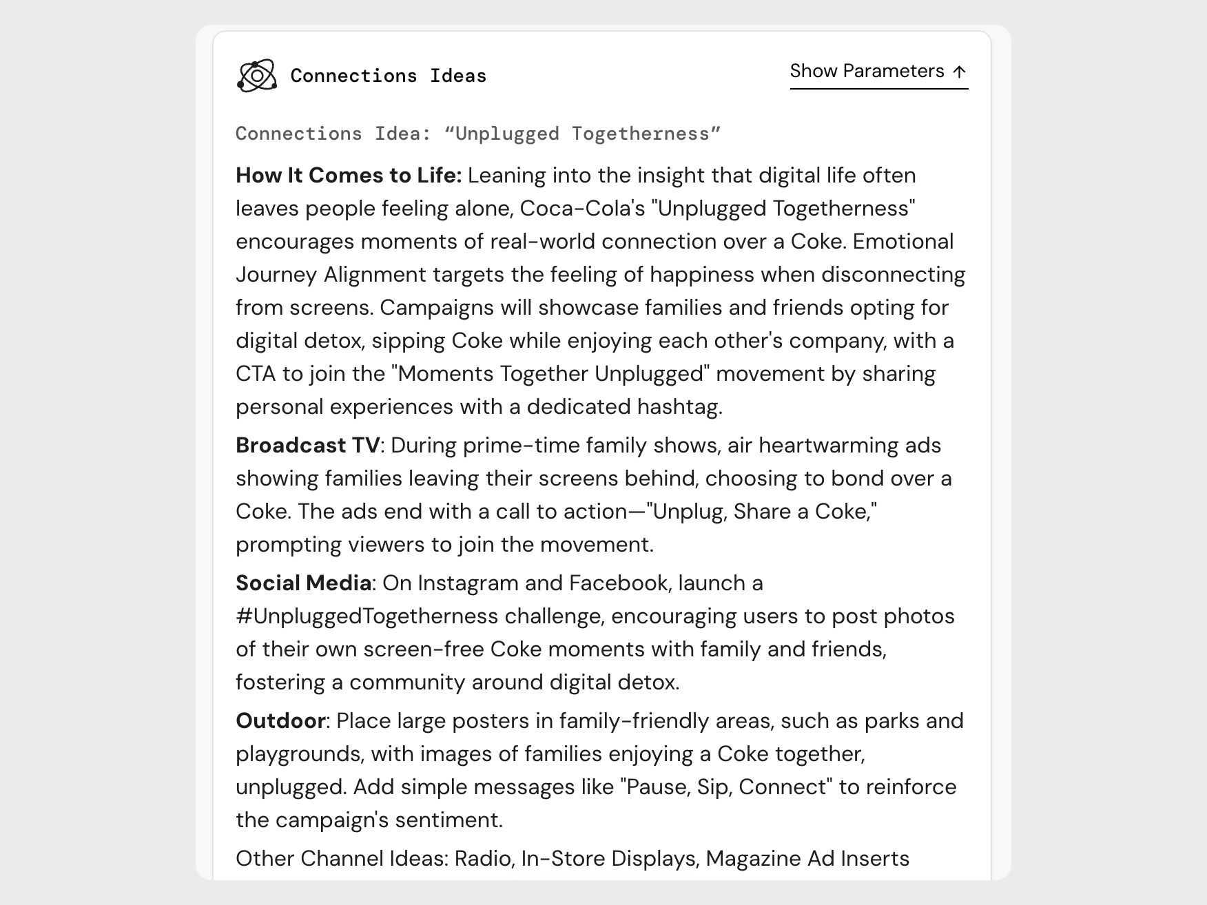 Each time you hit Spark, you’ll get 3 distinct Connections Ideas, each offering a different way to bring your campaign to life in the real world. Every idea connects back to your original insight and strategy, but stretches it in a unique direction.