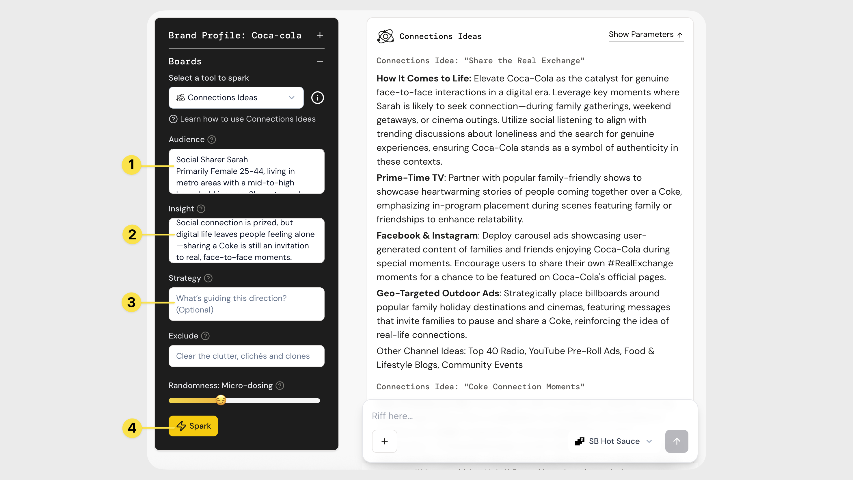 - Hit Spark and start exploring. You'll get back three overarching Connections Ideas, followed by the channels or moments to bring them to life.