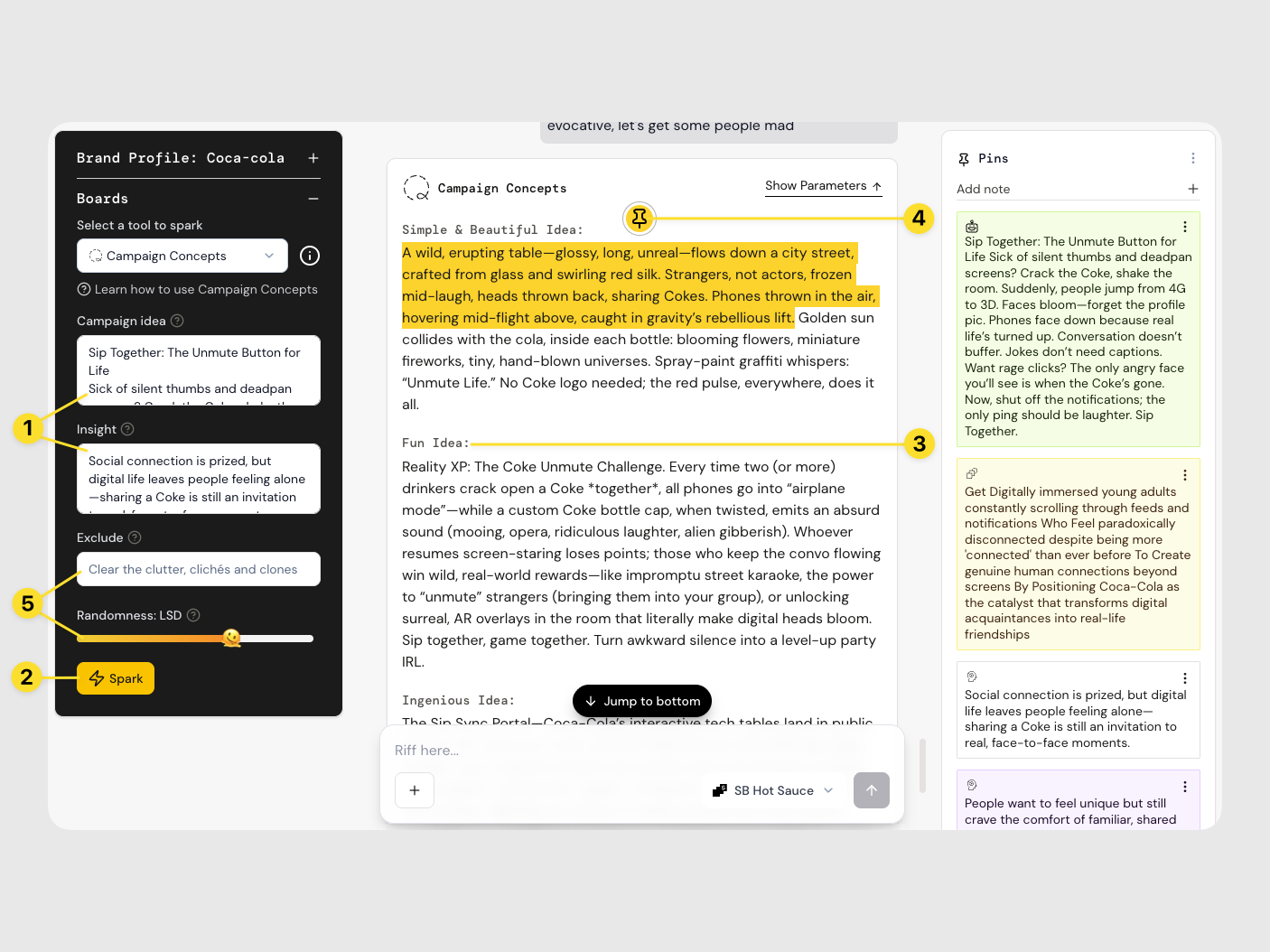 - Explore the angles. Each Spark returns campaign concepts across different styles , from Simple and Fun to Cultural Commentary and Participation. Don’t stop at one hit , Spark again to stretch the idea further.