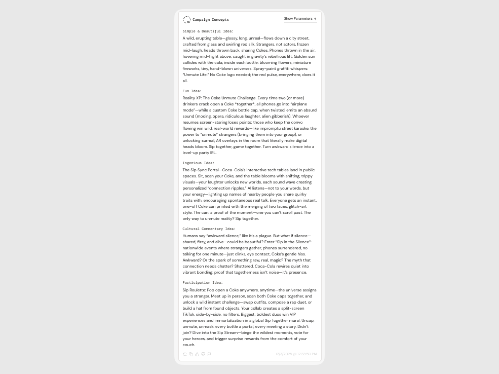 Each Spark gives you a set of campaign concepts, each framed in a different creative style. These help you explore the same core idea through multiple lenses , from big, bold executions to playful, people-powered formats.