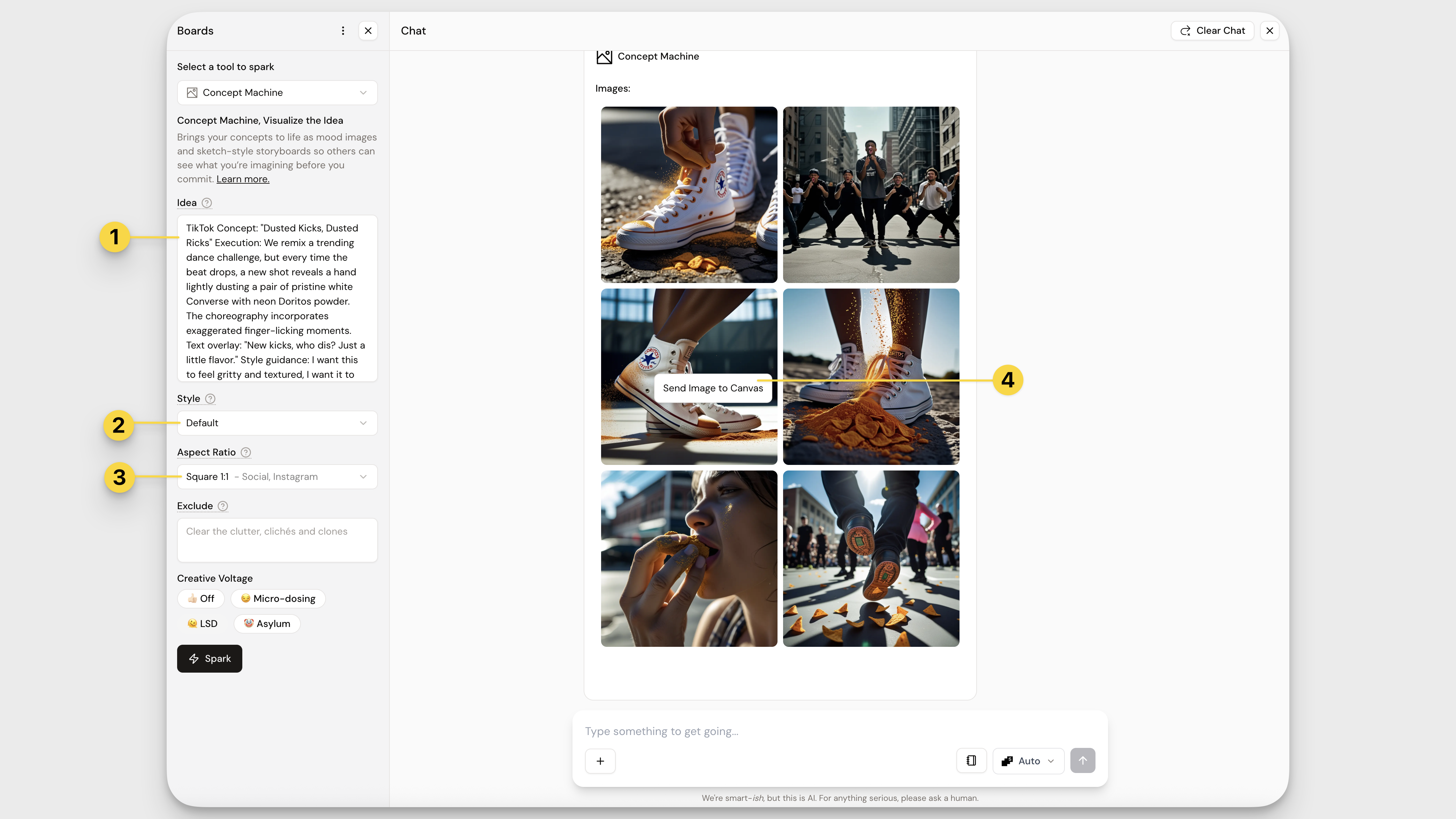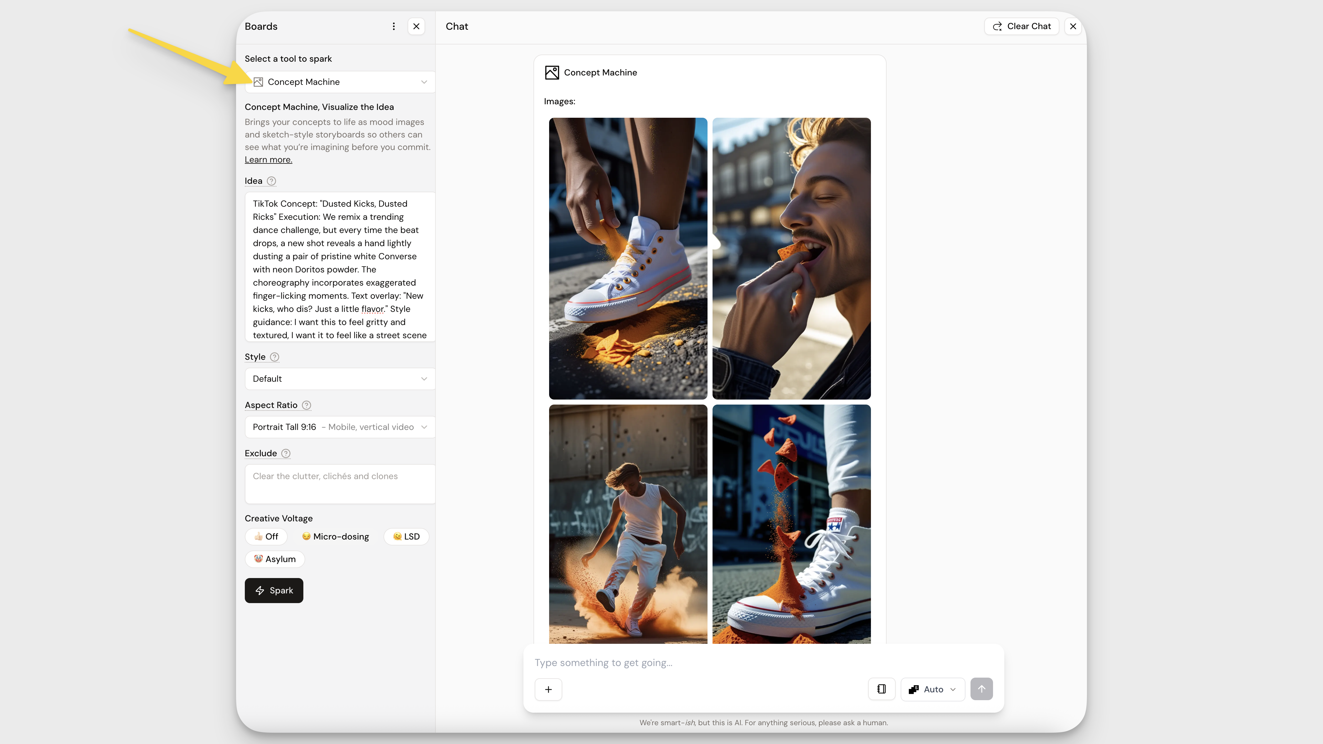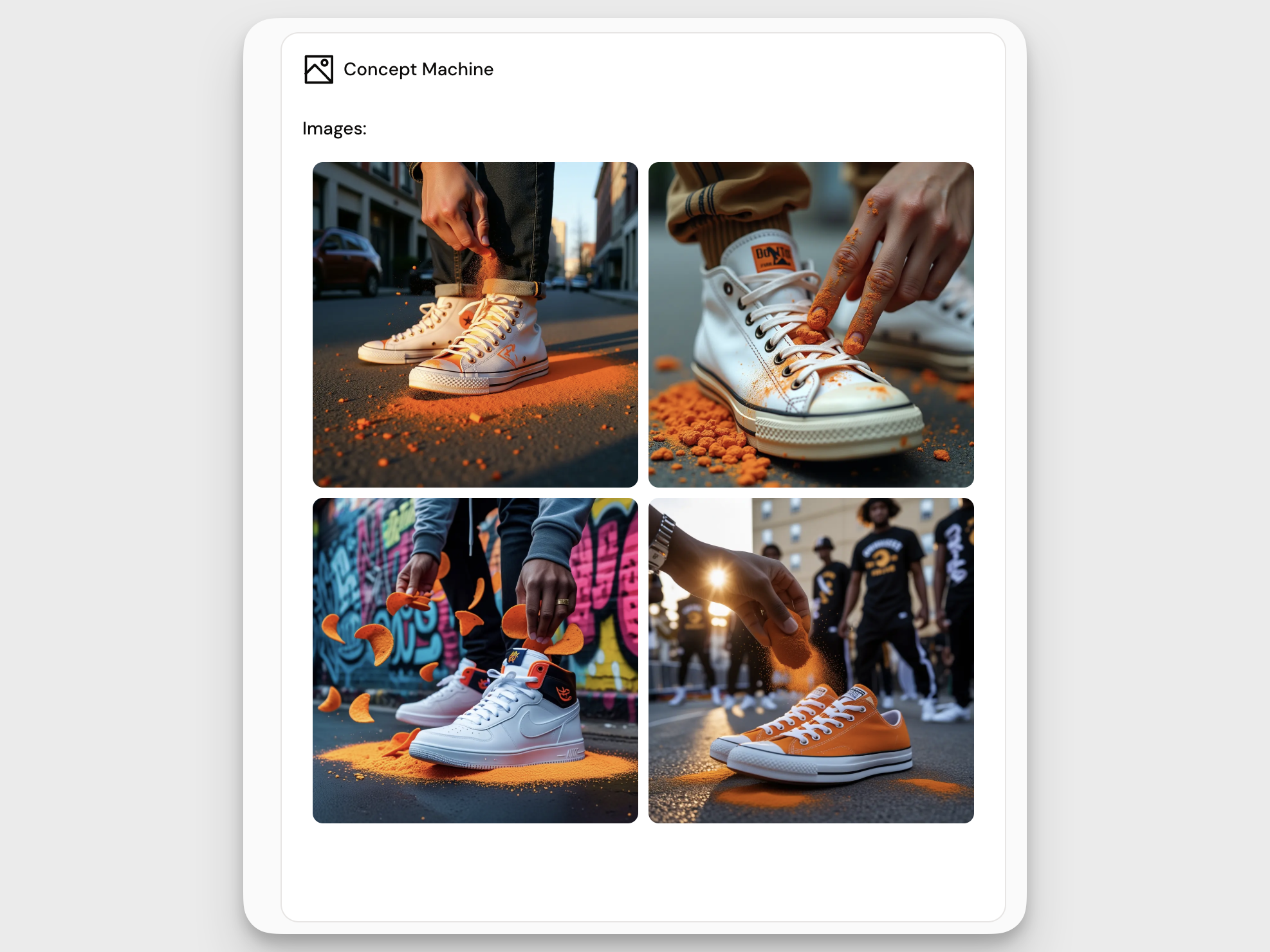 The Concept Machine is your visual thinking partner. It helps you explore the look and feel of an idea, whether you’re building out a creative platform, moodboarding a direction, or capturing a vibe that’s hard to write down. It’s not about polish. It’s about unlocking what an idea could look like.
