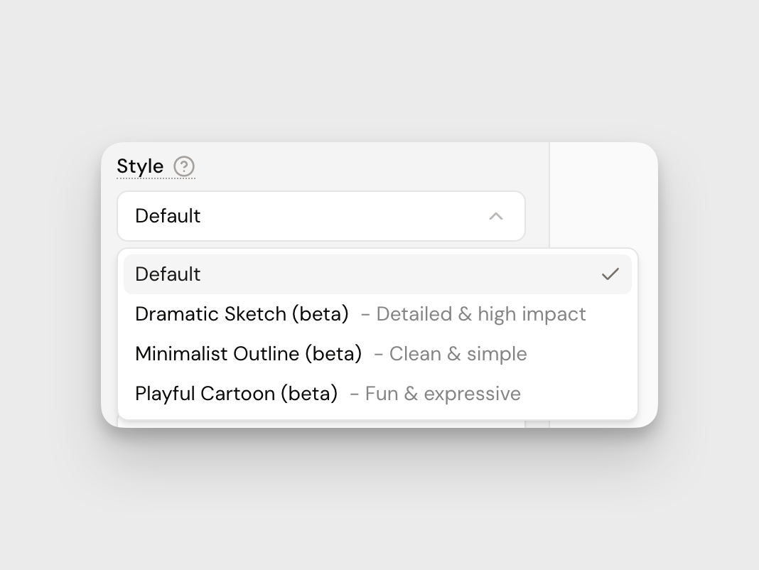 - Select your image style. Default gives you photo-style imagery. Want something more conceptual? Choose from our sketch styles, perfect for storyboarding: Dramatic, Minimalist, or Playful Cartoon.