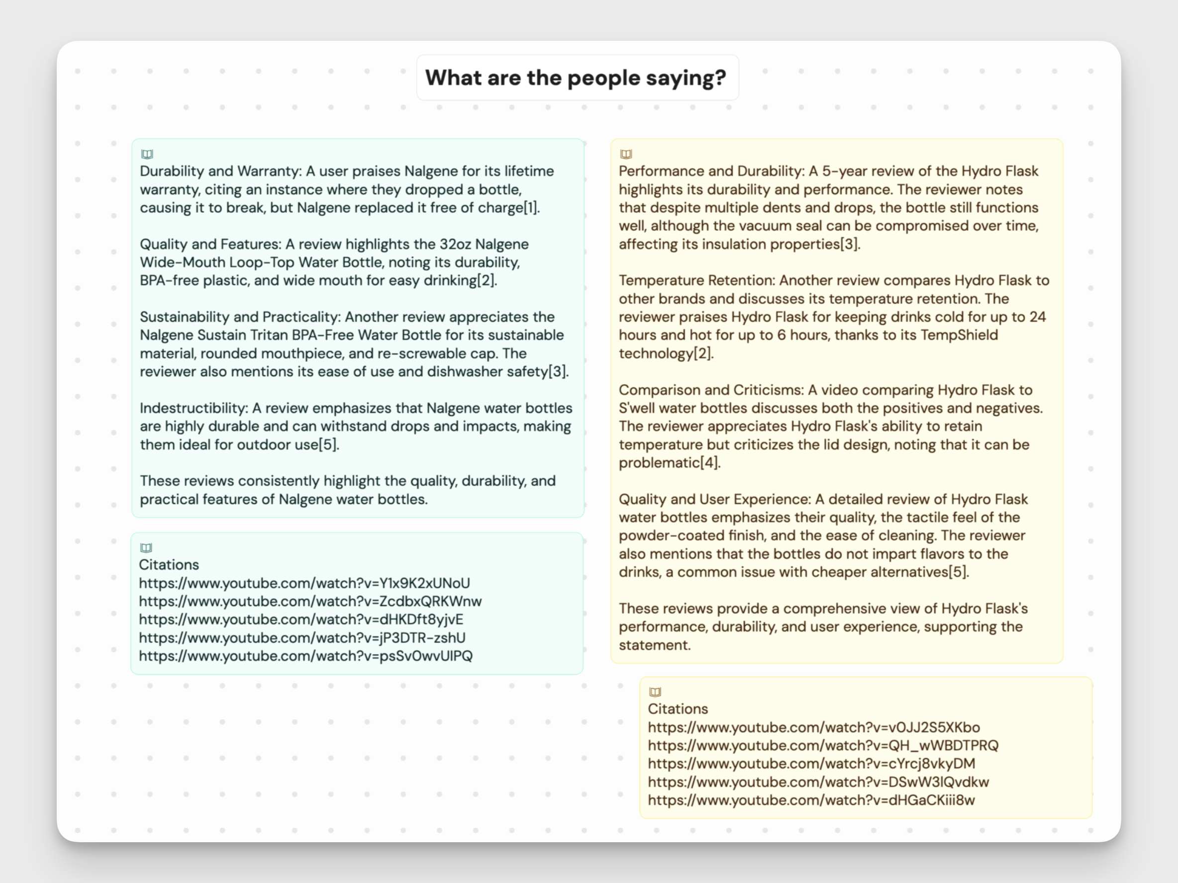 Example Validator Prompt: “Pull reviews for [Competitor Product] from YouTube + Reddit.”
