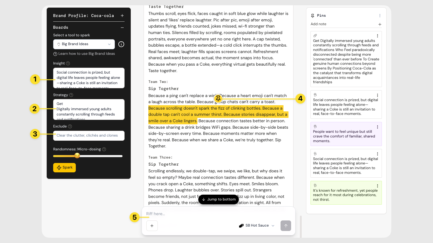 - Add insight for extra depth. Drag your best pinned insight into the tool ,whether it’s from Brand Strategy, Insight Digger, or your brain. These help shape outputs that are sharp, relevant, and on-brand.