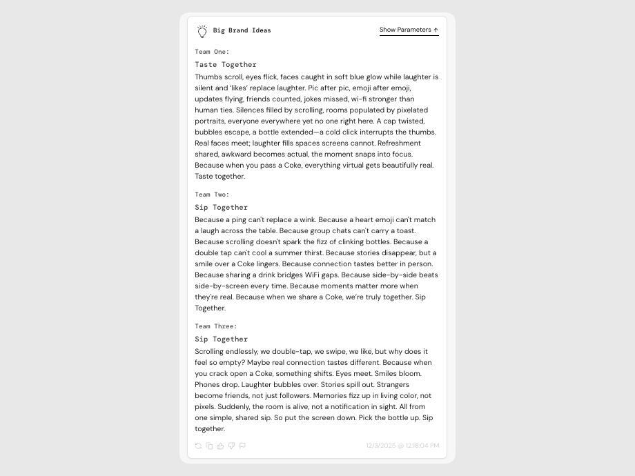 The Big Brand Ideas board helps you generate bold taglines and manifestos that capture the heart of a brand. Whether you're writing from scratch or building off a strategy, this board helps you explore language, shape meaning, and land on something iconic.