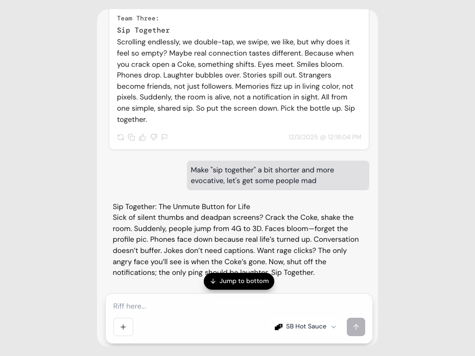 Each time you hit Spark, you’ll get three different creative routes , a mix of taglines and manifestos. Think of them as variations on the same idea, each with a different tone or take.