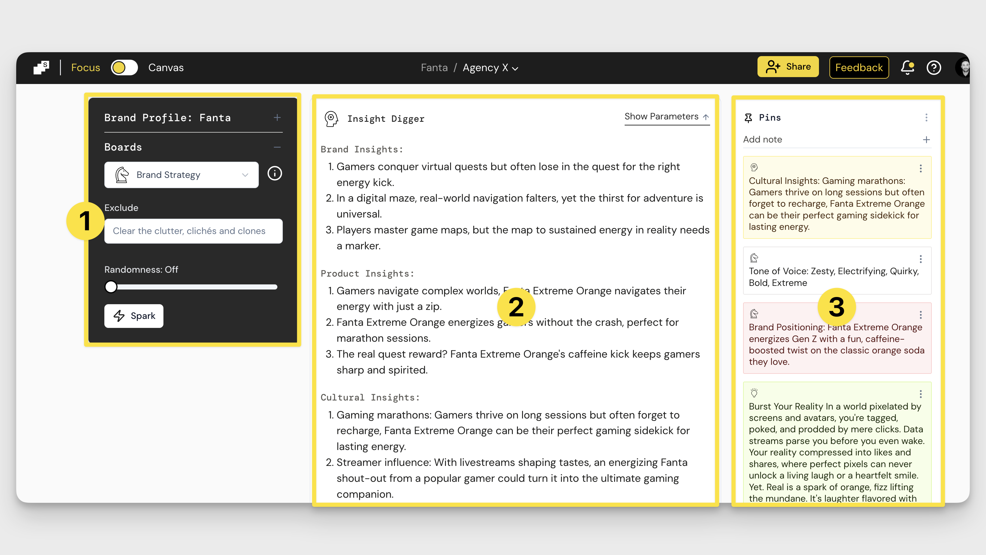 Your session starts in Focus Mode — a clean layout with your 1. Control Panel on the left, 2. Outputs Channel (that’s where your ideas show up) in the center, and your 3. Pin Bar on the right. This view is ideal for reading, refining, and deep thinking.