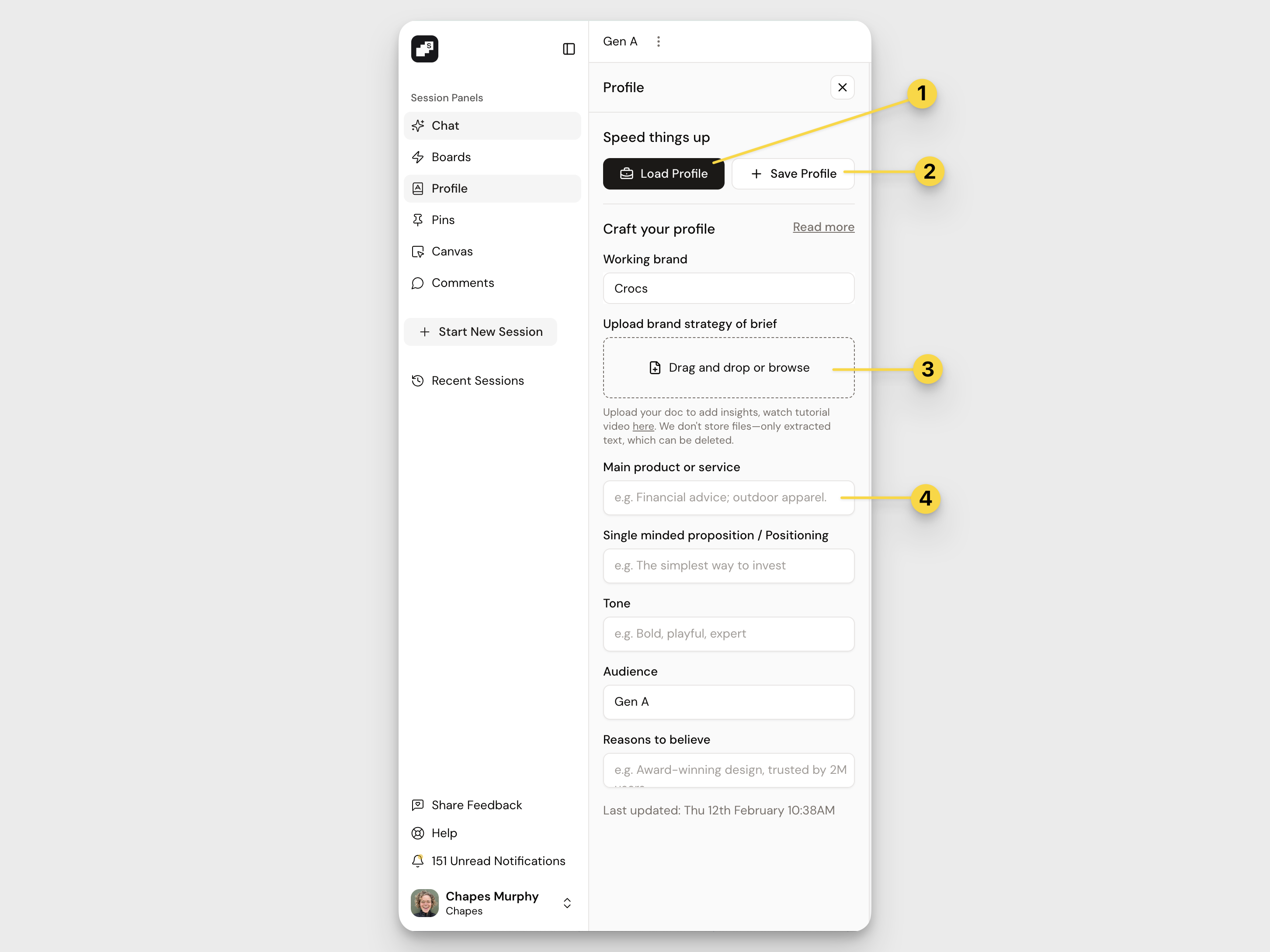 - Upload a brand strategy or brief: Drag and drop a document to extract key insights. (At the moment, Profiles support uploading one document at a time.)