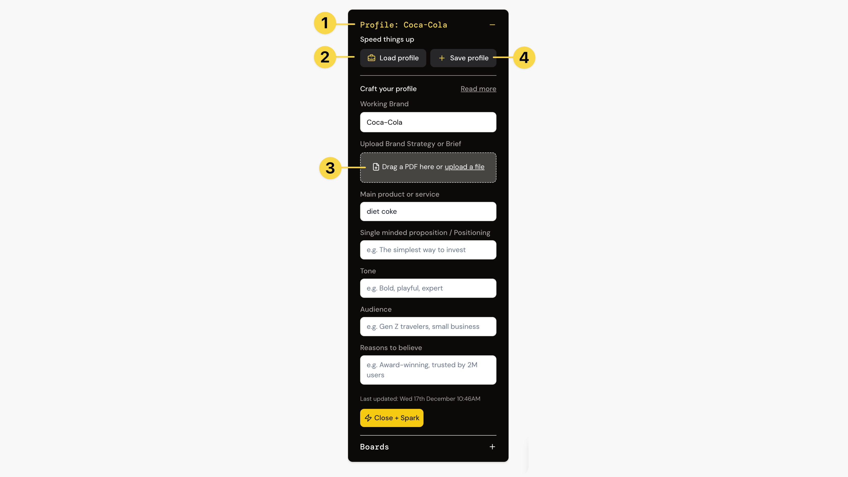 You’ll find your Profile at the top of the control panel on the left. This is where you drop in the context that guides Springboards during your session. You can drop in a PDF brief and add additional details like product, positioning, tone, audience and RTBs.