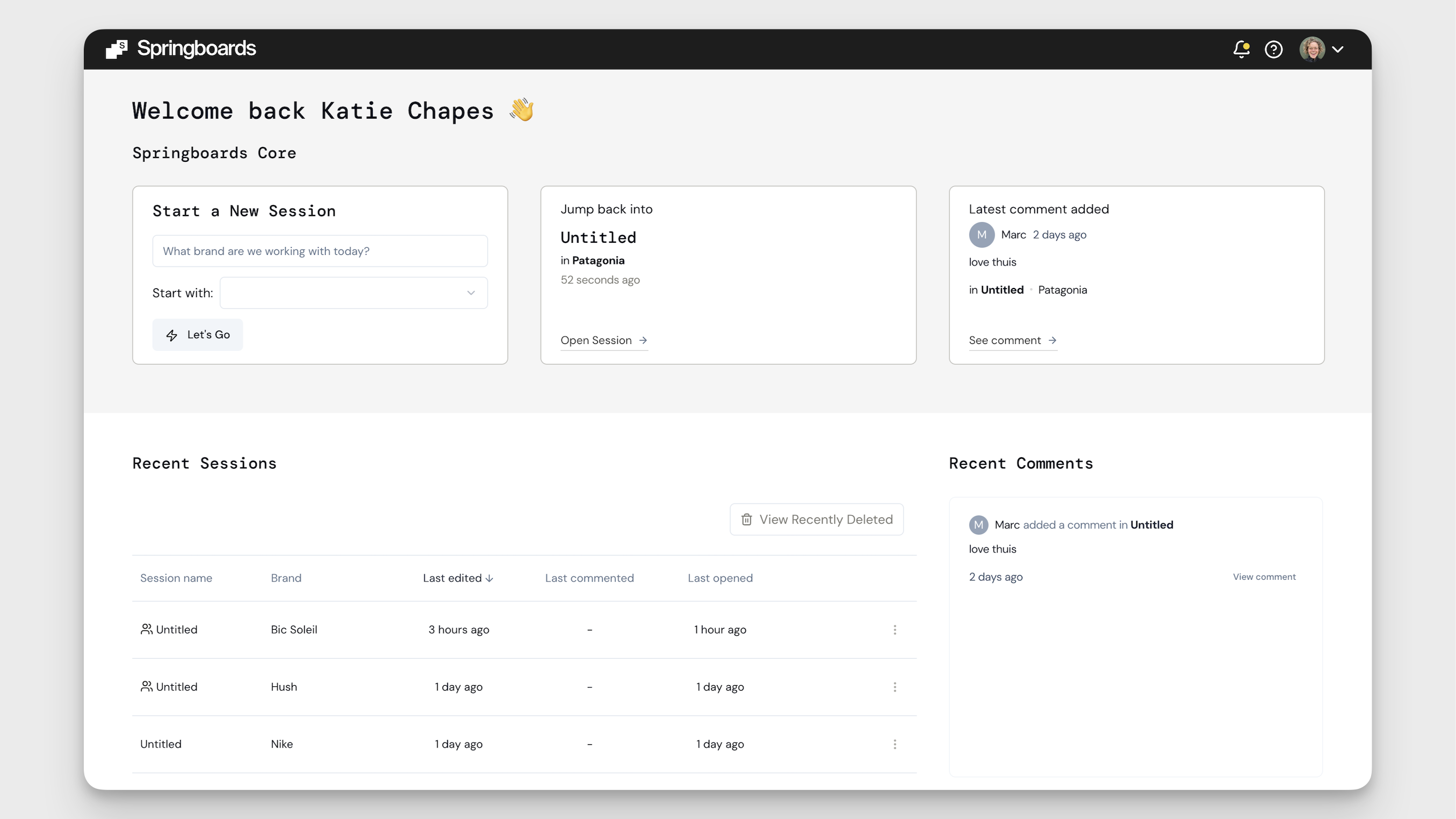When you login to Springboards, you arrive at your Dashboard where you can either decide to Start a New Session or scroll down to jump back into a Recent Session you started previously.