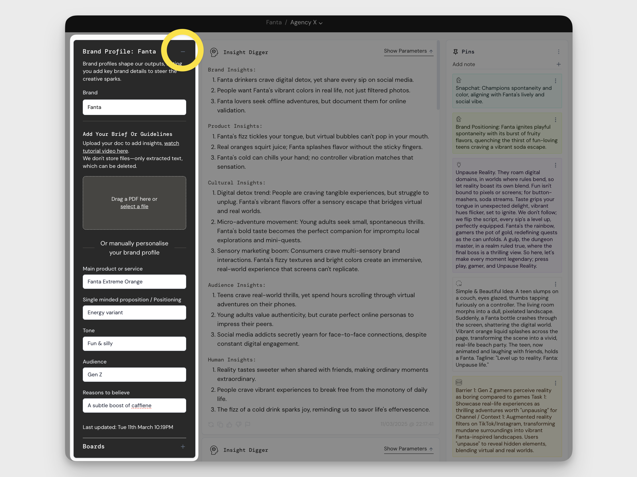 - How do I tweak the outputs for a sub-brand or audience? Refine your Sparks with the Brand Profile tab. Learn more here.