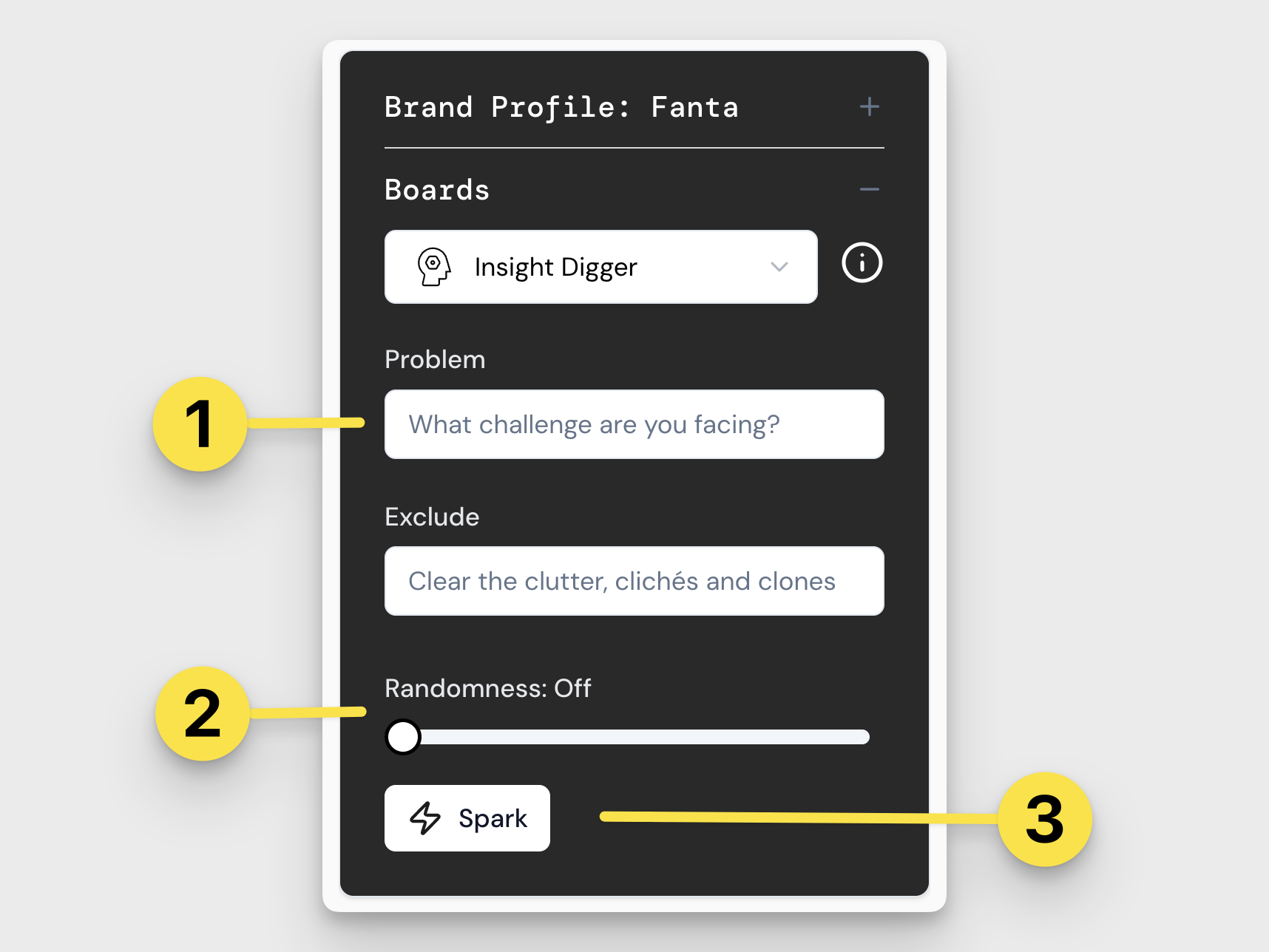 That big Spark button in the control panel? It’s your idea engine. Hit it to generate outputs from the board you’re on. They’ll show up to the right (in Focus Mode) or below (in Canvas Mode). Every time you Spark, it stacks — so you can scroll back through past outputs whenever you want.