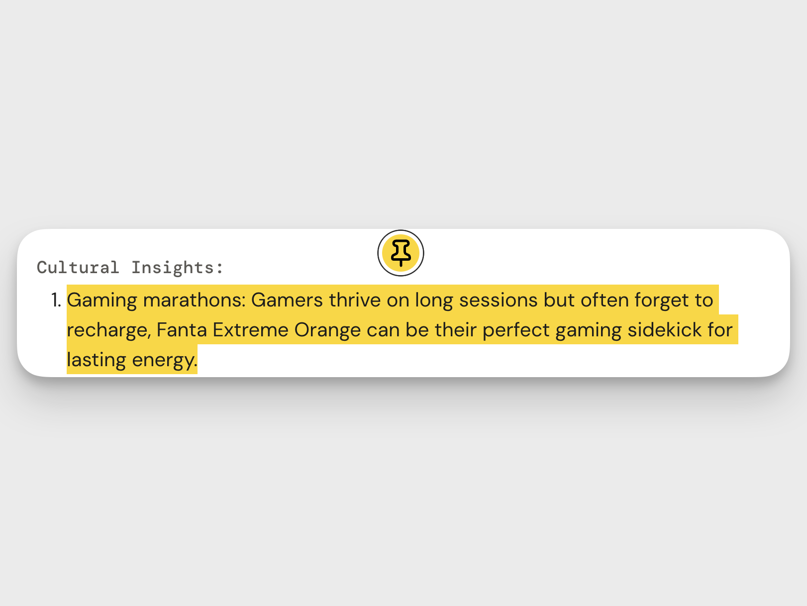 See something you love? Highlight it and hit the yellow Pin button that appears. That saves it to your Pin Bar. You can also add your own notes as Pins, edit any Pin with a double click, or use the three dots in the corner to color-code it or send it to Riff with Riffbot for a creative remix.