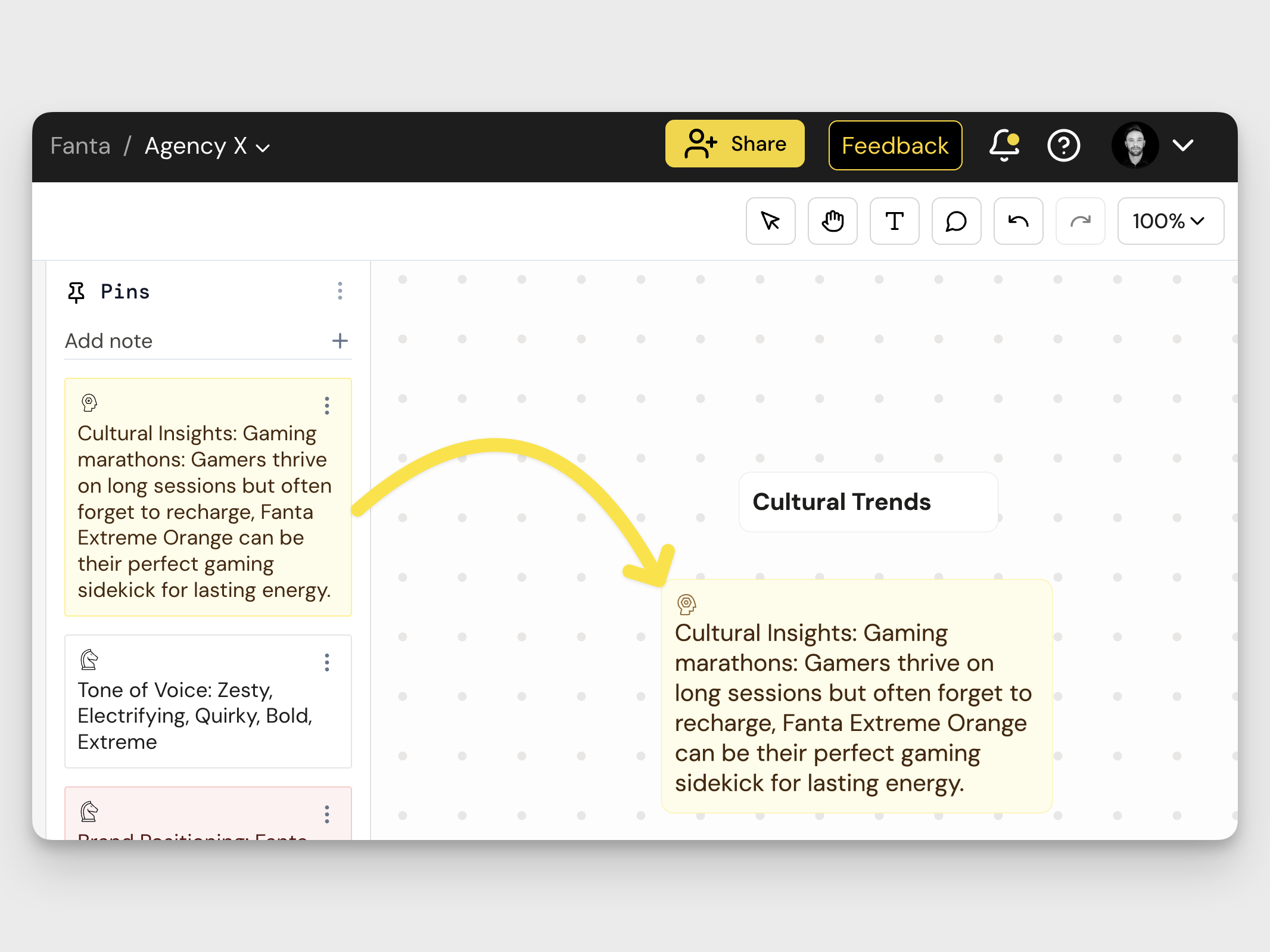 Pins aren’t just for saving — you can also drag them. Drag Pins into any input field in the control panel to build your next Spark. In Canvas Mode, drag them onto the Canvas so your team can see them, riff on them, or leave comments.