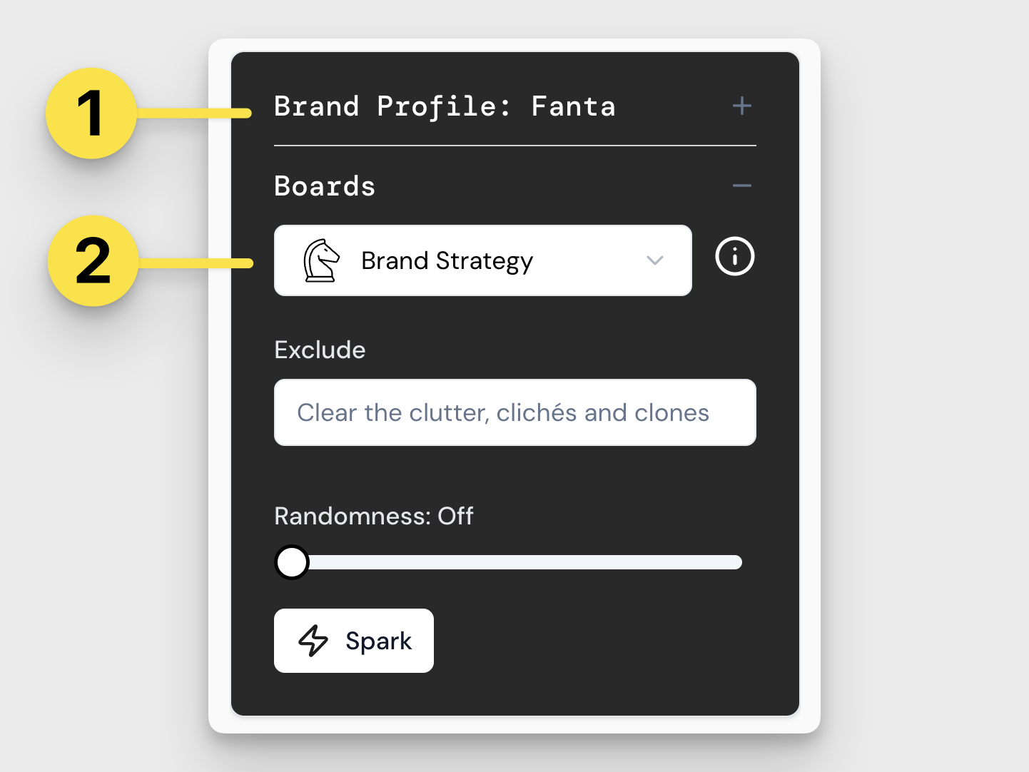 - Then hit the Spark button to start generating. Try different Randomness levels and hit Spark a few times to see all the different directions your idea could go.